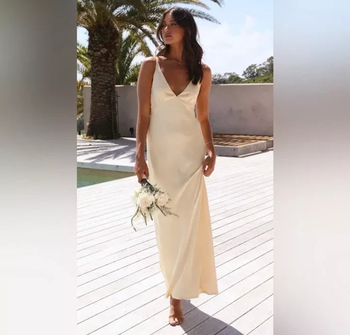 This stunning yellow satin dress showcases a flattering mermaid silhouette paired with a graceful V neckline, creating a timeless and elegant look. The long length enhances its formal appeal, making it an excellent choice for proms and special parties. Crafted to highlight your figure, this dress offers a blend of sophistication and vibrant charm for a memorable evening.