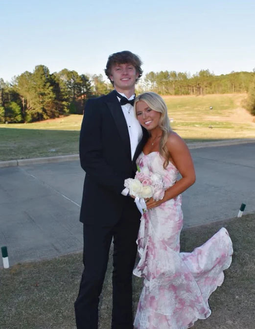 This elegant off-shoulder evening dress features a floral print and a mermaid silhouette that flatters the figure with a slim fit design. The long gown is enhanced by ruffled detailing, adding texture and movement for a dramatic effect. Ideal for formal parties, this dress combines classic sophistication with contemporary style for a standout look.